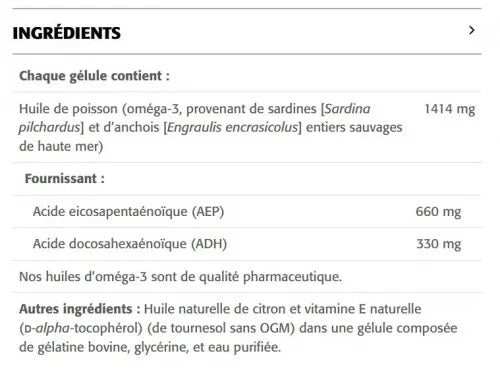 660 mg d’AEP (EPA) et 330 mg d’ADH (DHA) par gélule