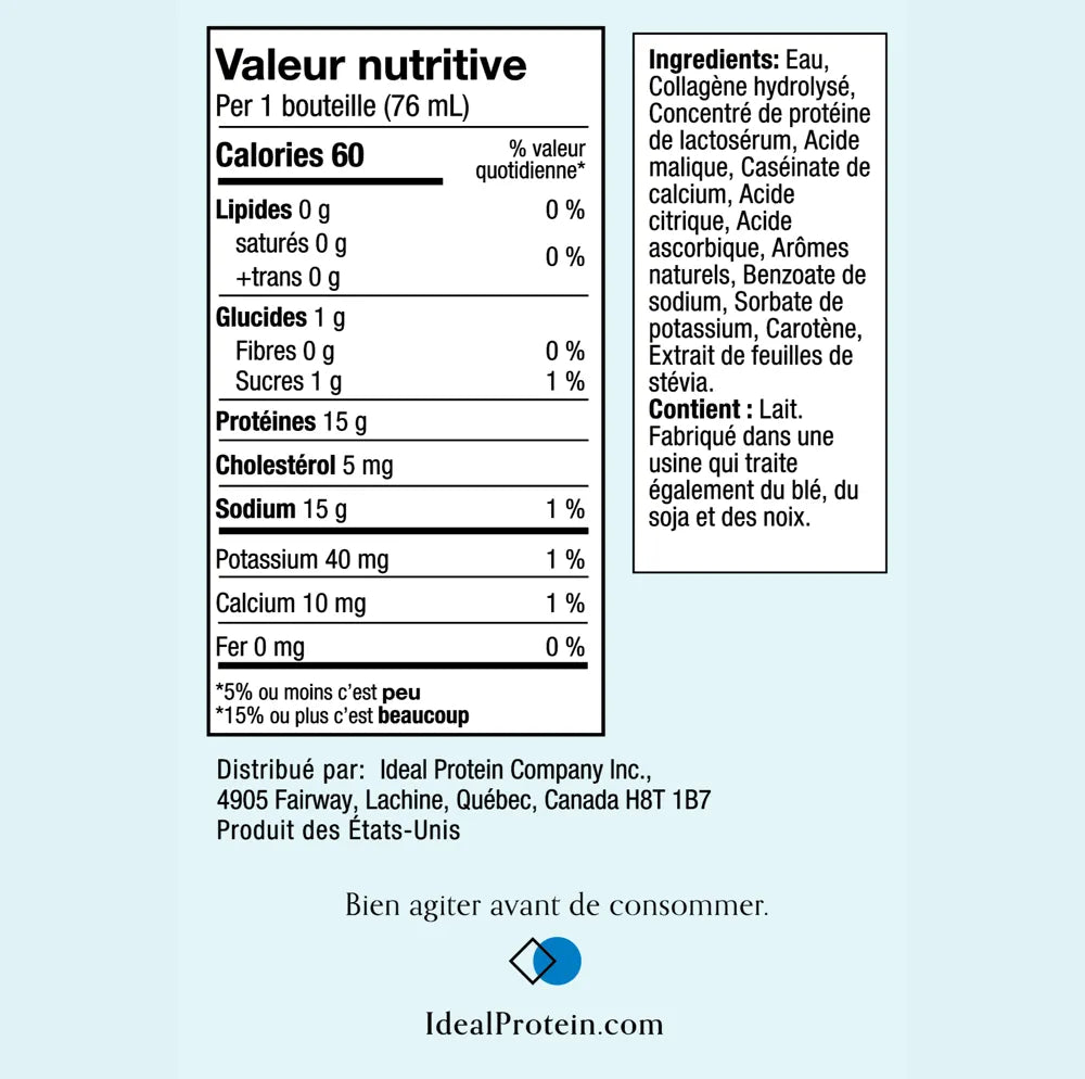Veuillez noter que tout achat de produits Ideal Protein inclura une consultation gratuite avant la livraison afin de mieux cibler vos besoins. Notre équipe d'experts vous contactera dans les 48 heures suivants votre commande pour planifier cette consultation. Nous vous remercions de votre compréhension et de votre coopération. Prenez note qu’aucune commande ne quittera nos entrepôts avant de vous avoir parlé personnellement.